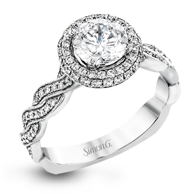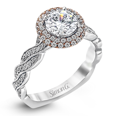 Featuring an elegant twisted contemporary design, this white and rose gold engagement ring complemented by .51 ctw of shimmering round cut white diamonds. Center stone not included. Our rings can be designed to fit any center stone.