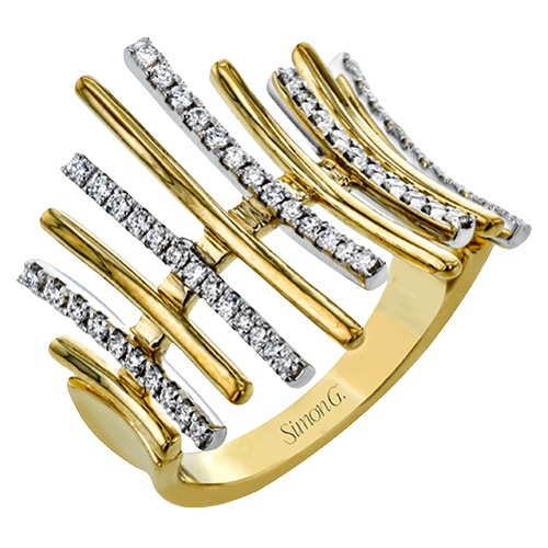 This yellow/white 2tone ring has a concave shape and features alternating bars of high polish gold, and diamonds 0.41 ctw.