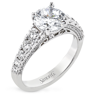 Filigree details underneath the center stone and diamonds that extend down the sides of this ring make it far from ordinary. Center stone not included. Our rings can be designed to fit any center stone.