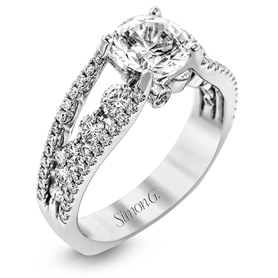 The lovely vintage style of this white gold engagement ring is further enhanced by .91 ctw of shimmering round cut diamonds. Center stone not included. Our rings can be designed to fit any center stone.
