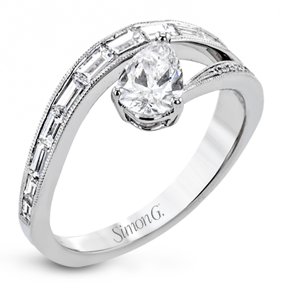Like lightning zig-zagging across the sky, this dynamic 18k white gold ring contains a flowing line of .62 ctw baguette diamonds and one .55 ct pear shaped diamond set at an angle. Center stone not included. Our rings can be designed to fit any center stone.