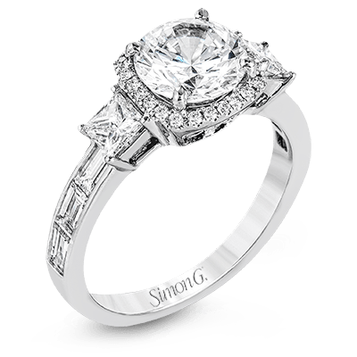 The impressive circular halo of this white gold engagement ring is set with .10 ctw round cut white diamonds and emphasized by .43 ctw princess cut diamonds and .58 baguette cut diamonds. Center stone not included. Our rings can be designed to fit any center stone.