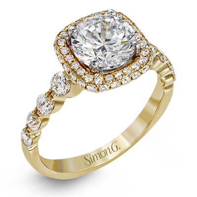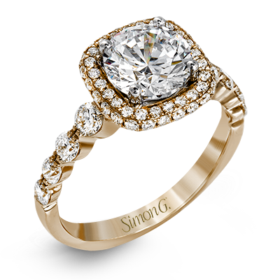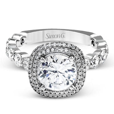 The delicate design of this classic white gold engagement ring features a sparkling pave halo accented with .86 ctw of shimmering round cut white diamonds. Center stone not included. Our rings can be designed to fit any center stone.