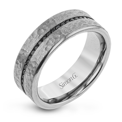 This distinctive yet understated wedding band features .60 ctw of black diamonds against a background of hammered gray gold.