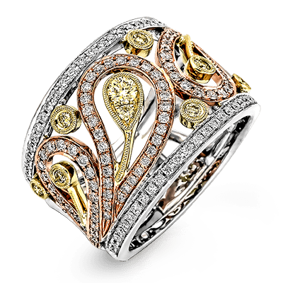 This vintage inspired tri-tone band features a delicate floral design accented by .55 ctw round cut white diamonds and .20 ctw round cut yellow diamonds set in lovely rose, yellow, and white gold.
