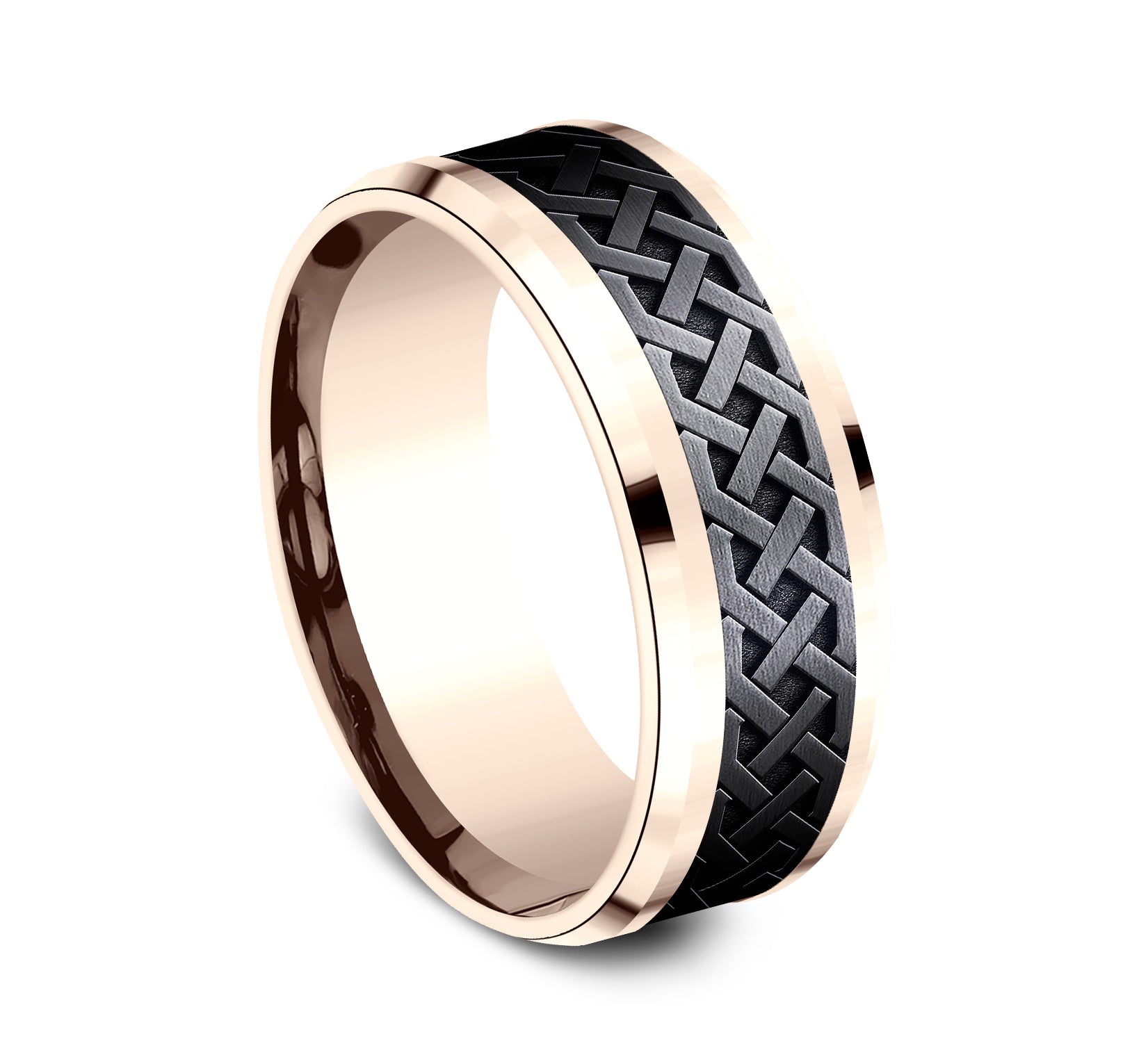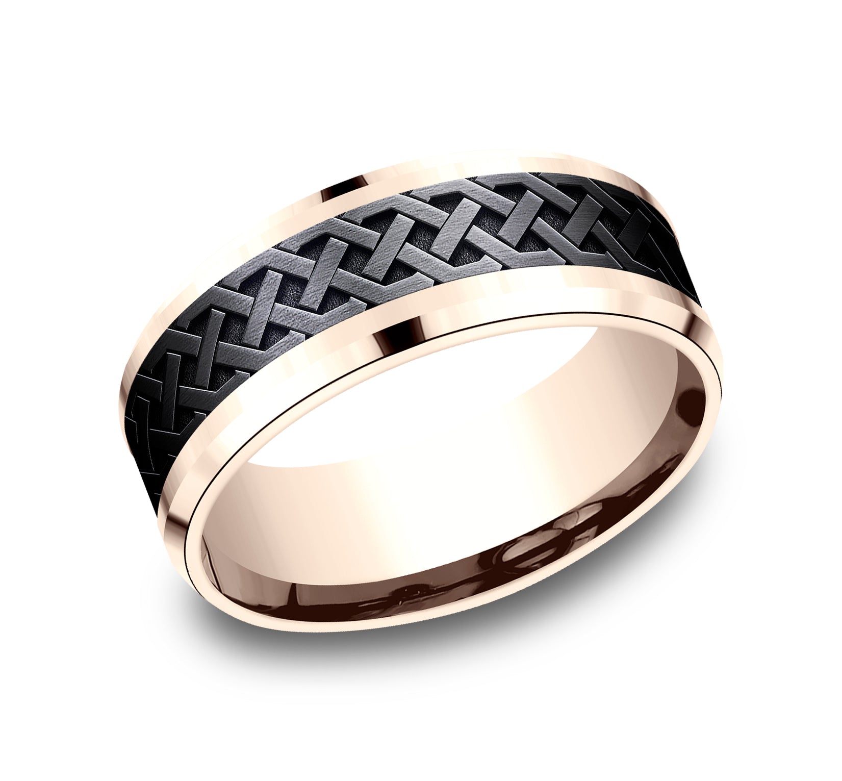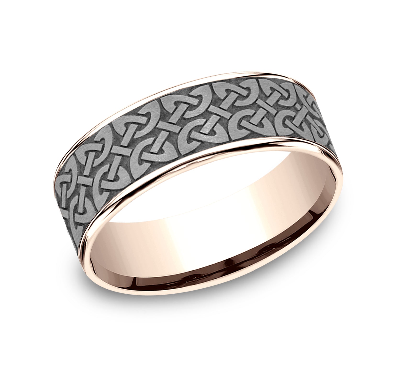 7.5mm, Comfort fit 14K Rose Gold and Grey Tantalum Celtic knot designed center, thin polished edges