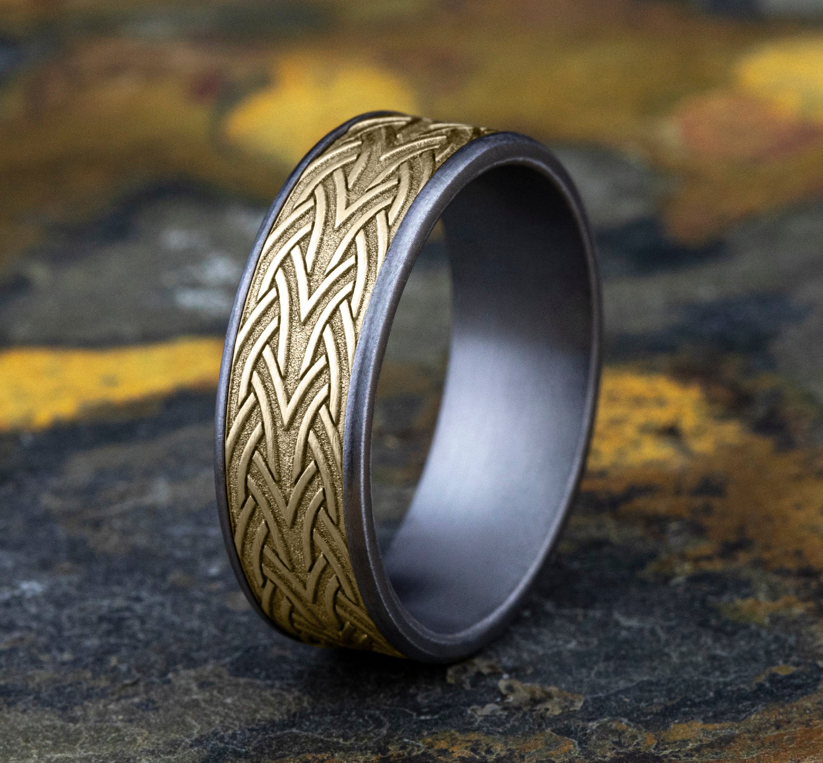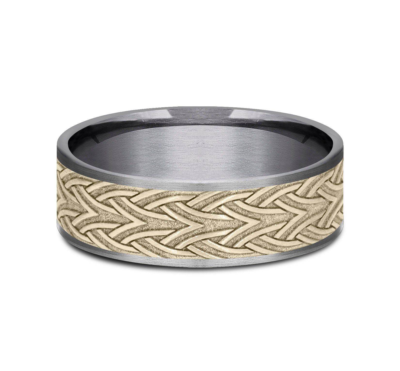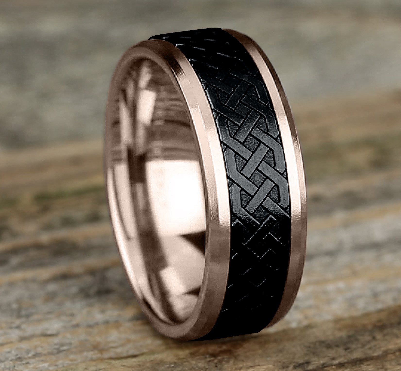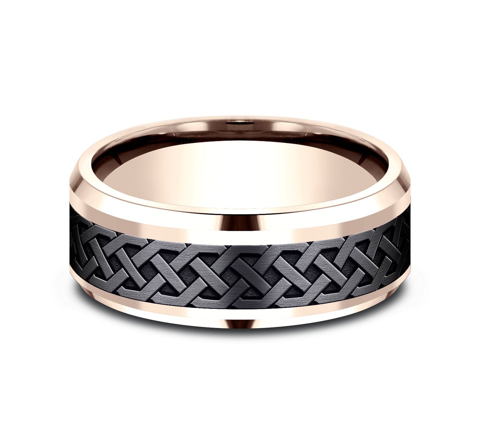 7.5mm, Comfort fit 14K Rose Gold and Grey Tantalum Celtic knot designed center, thin polished edges