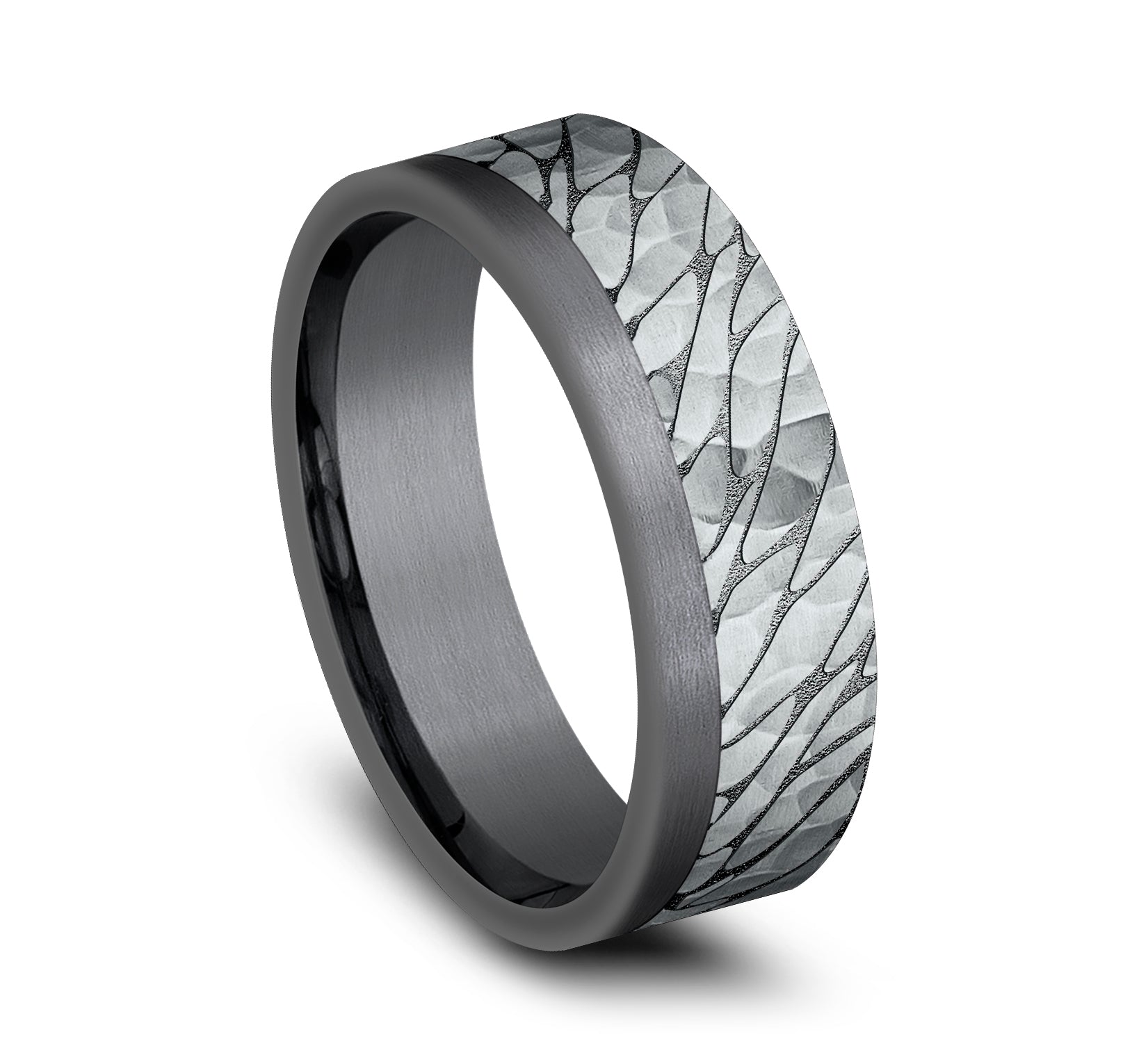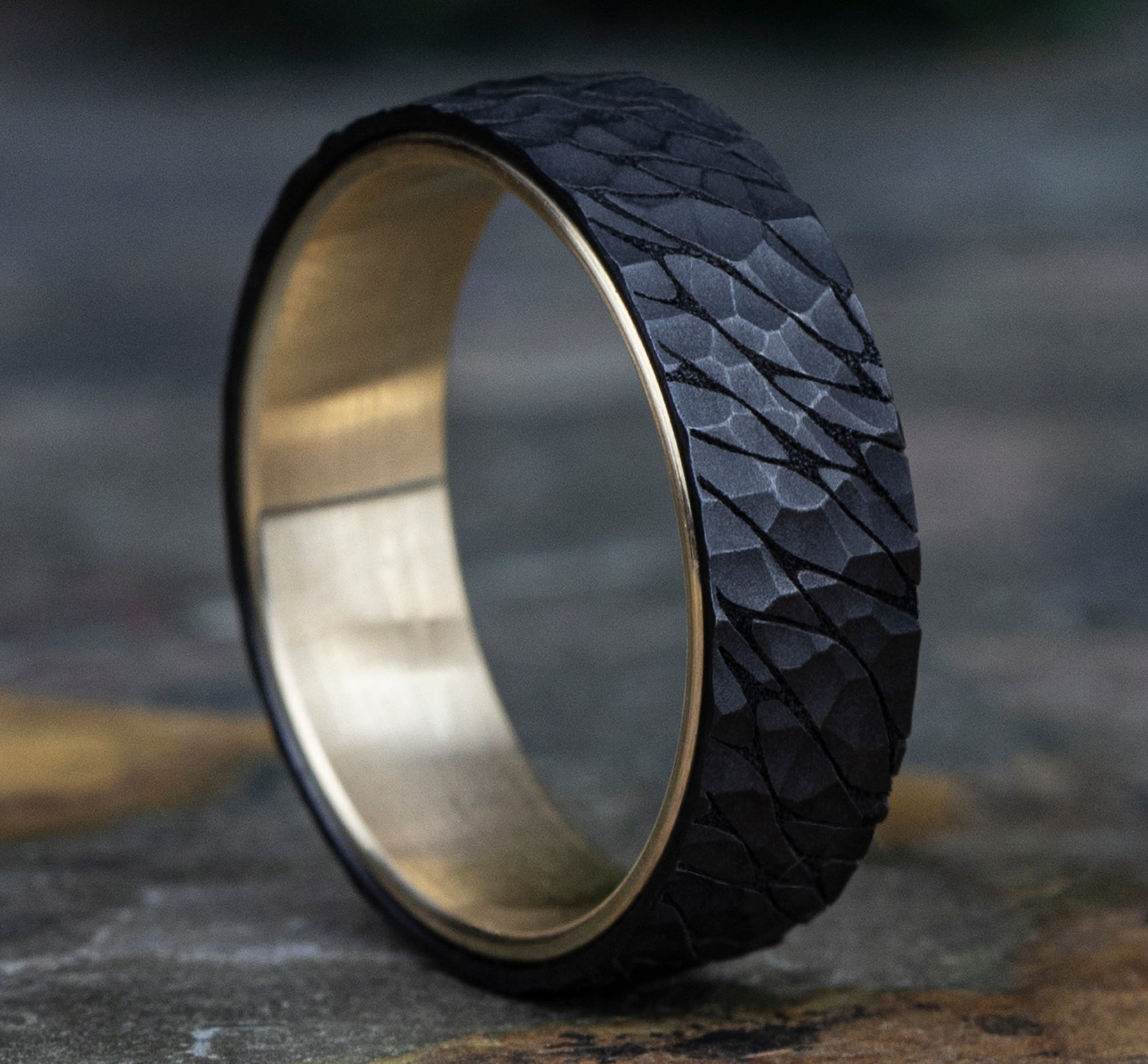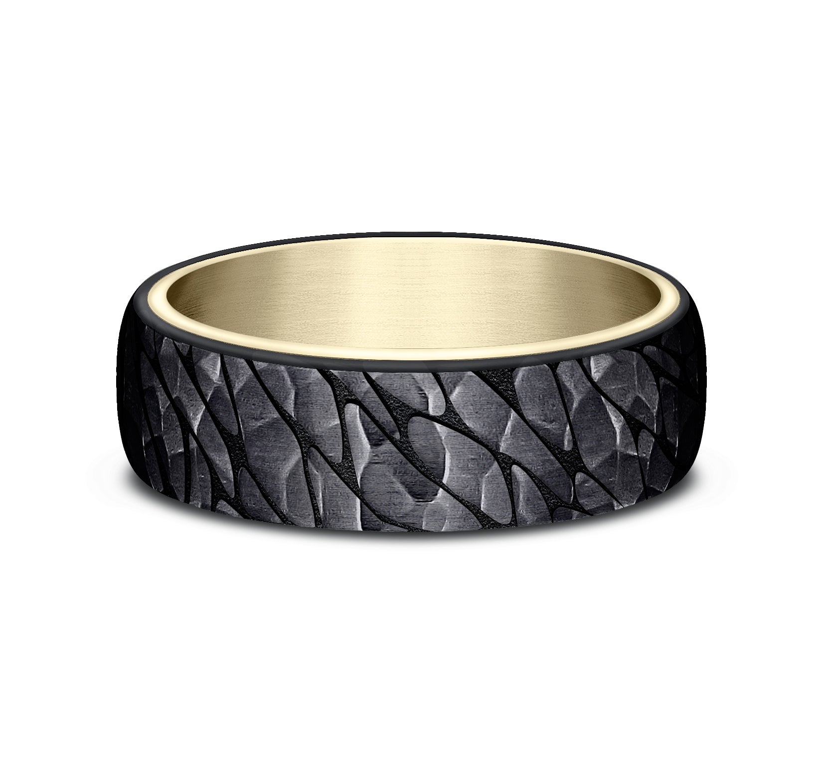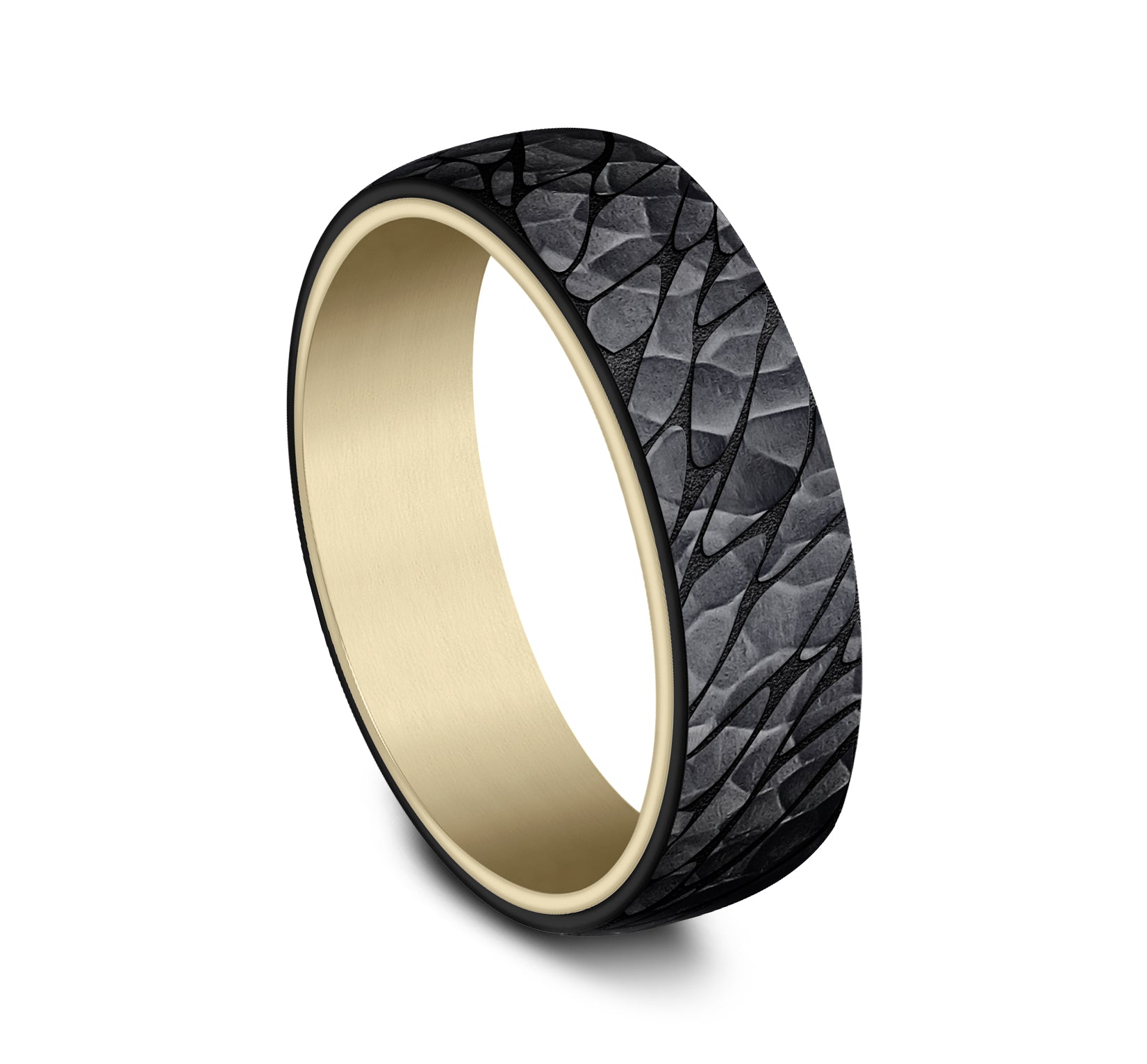 6.5mm, Comfort fit 14K Yellow Gold and Black Titanium Pebble pattern with hammered finish