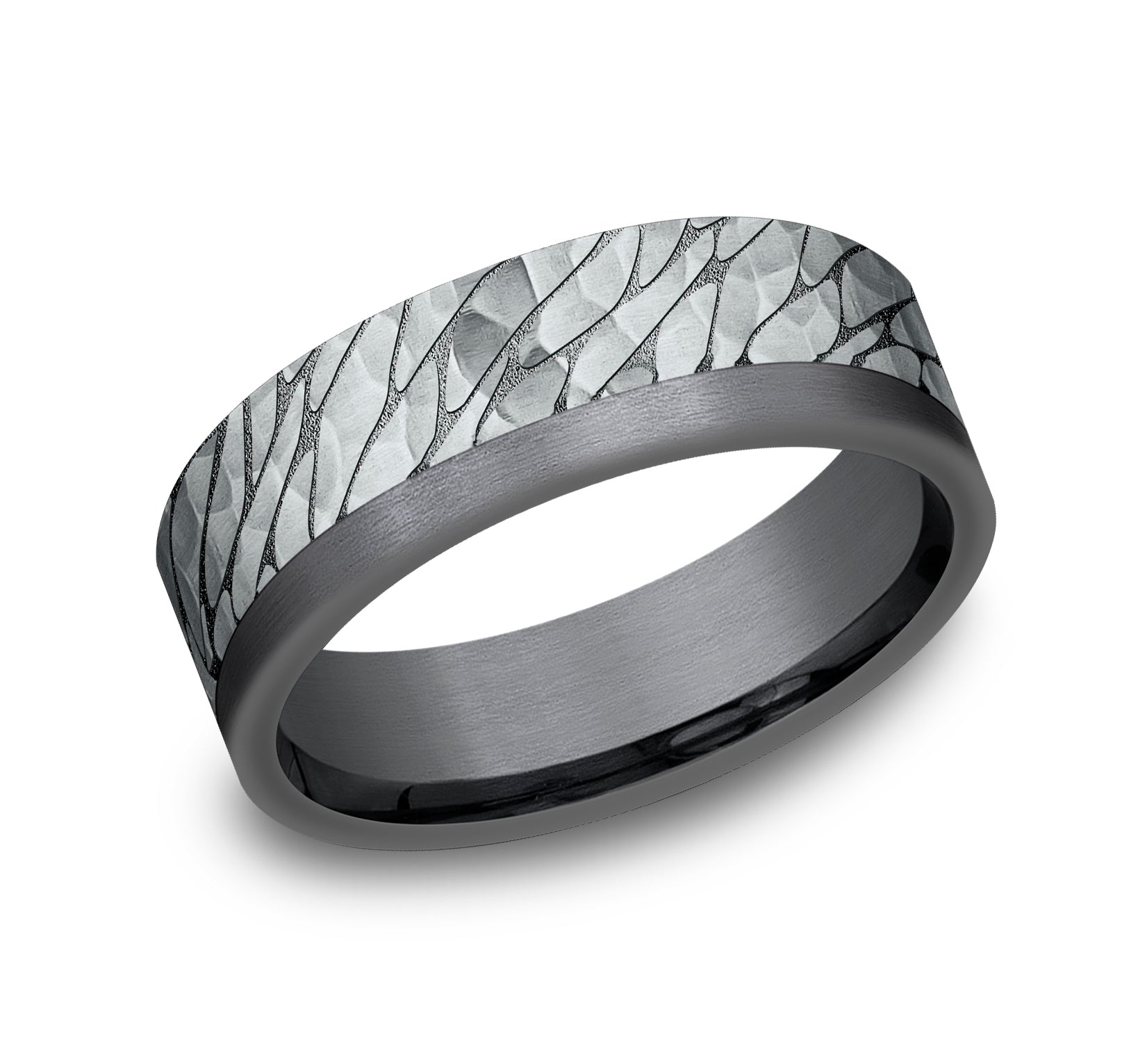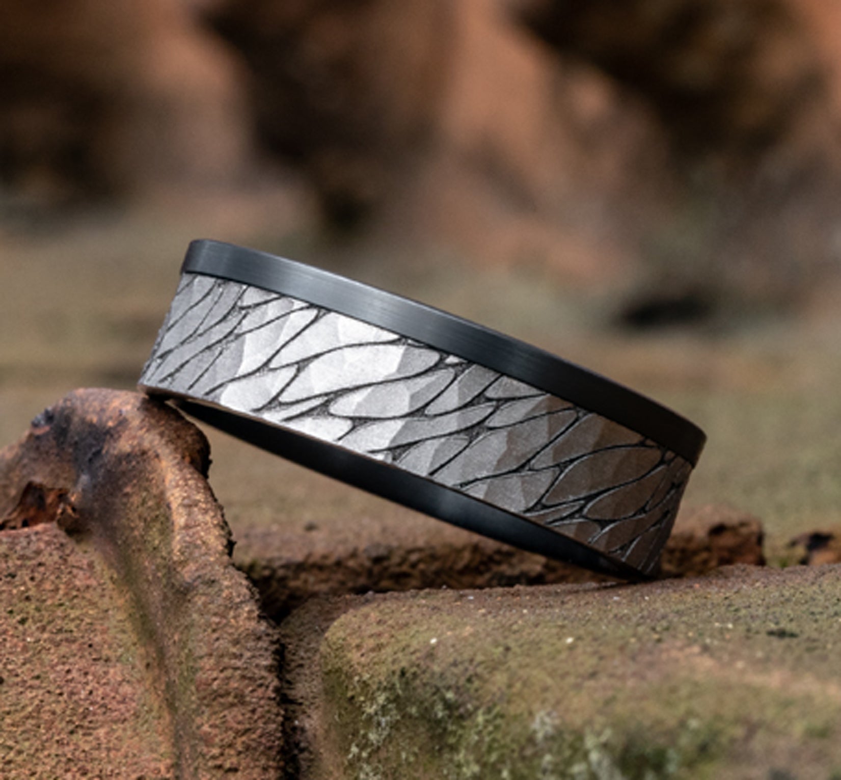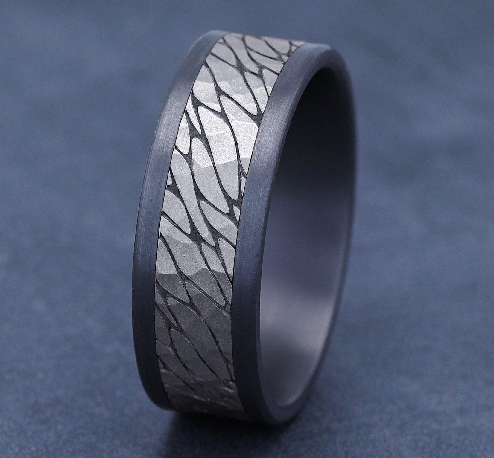 6.5mm, Comfort fit 14K Yellow Gold and Black Titanium Pebble pattern with hammered finish