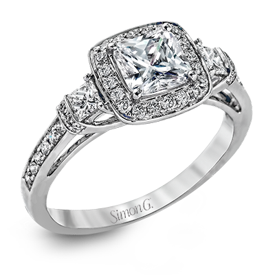 Featuring an intricate design, this white gold engagement ring is emphasized by .26 ctw of round cut white diamonds and .23 ctw of shimmering princess cut white diamonds. Center stone not included. Our rings can be designed to fit any center stone.