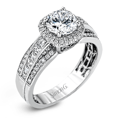 Featuring an impressive halo, this contemporary white gold engagement ring is accented by .22 ctw of round cut white diamonds and .42 ctw princess cut diamonds. Center stone not included. Our rings can be designed to fit any center stone.