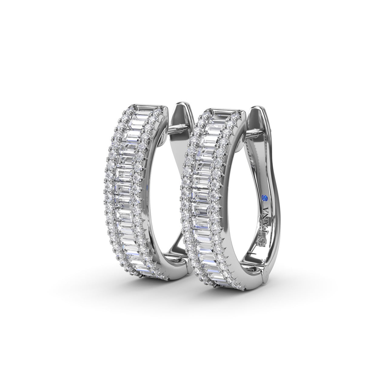 These hoop earrings feature straight baguette diamonds set horizontally, elegantly bordered by round diamonds. These earrings come in a variety of material types like 14K & 18K white gold, yellow gold, rose gold and can be customized.