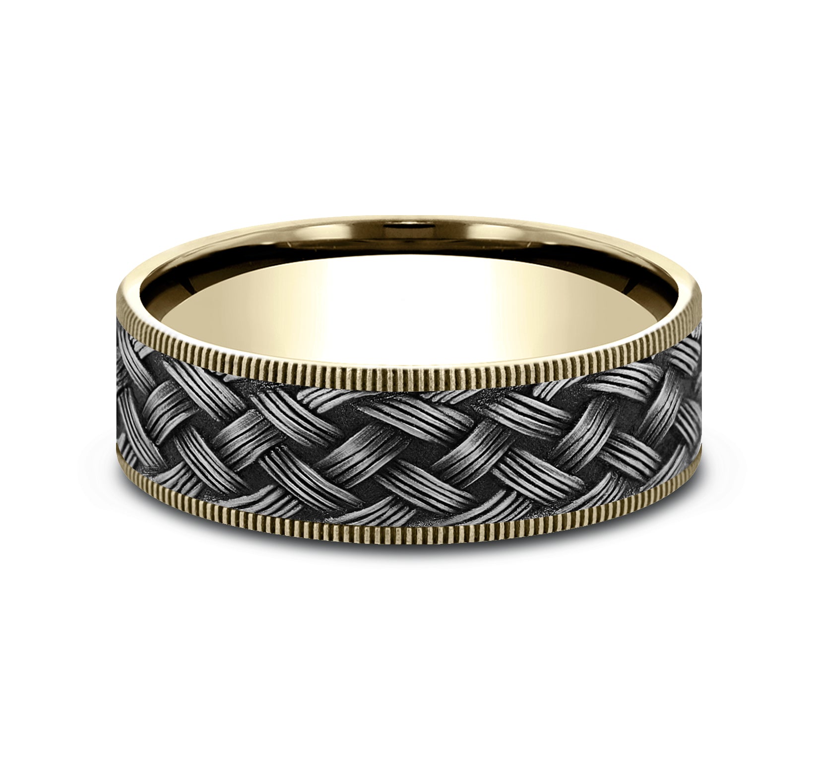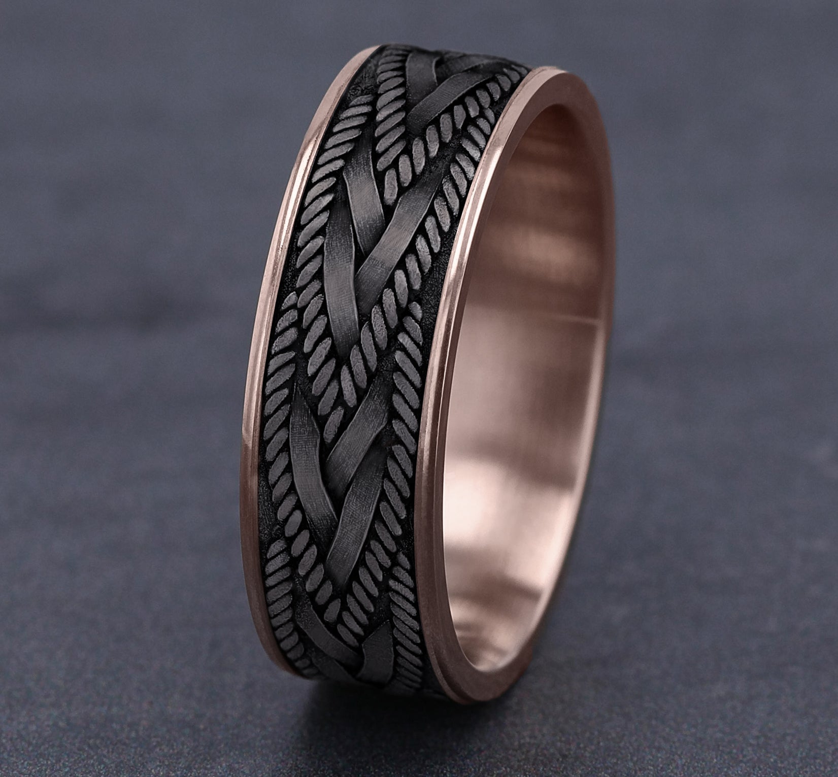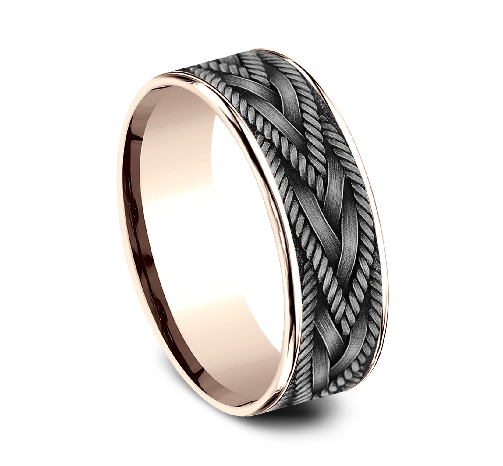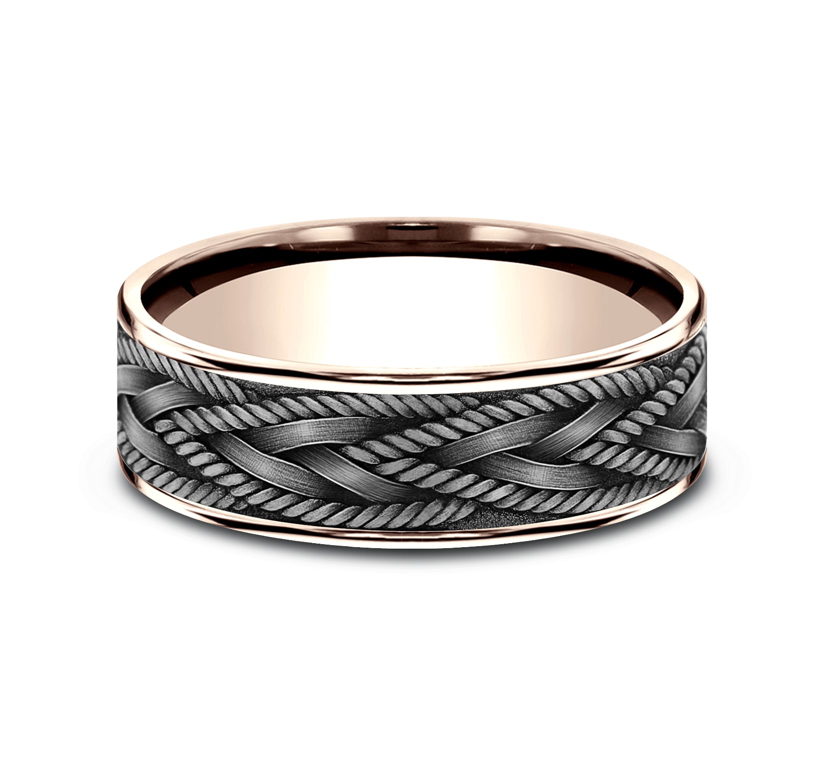 7.5mm, Comfort fit 14K Rose Gold and Grey Tantalum Rope and wheat knot braid pattern, thin edges