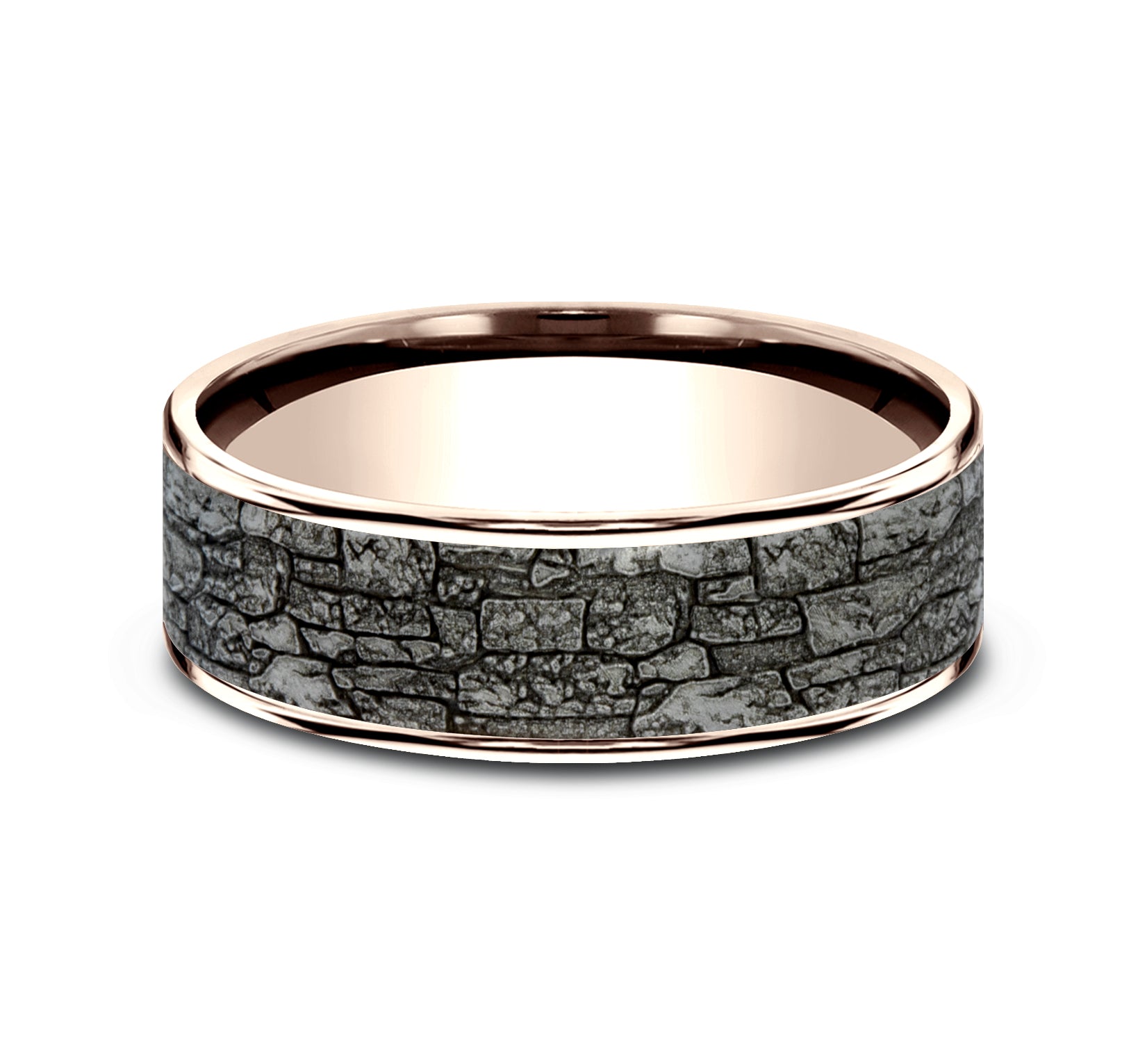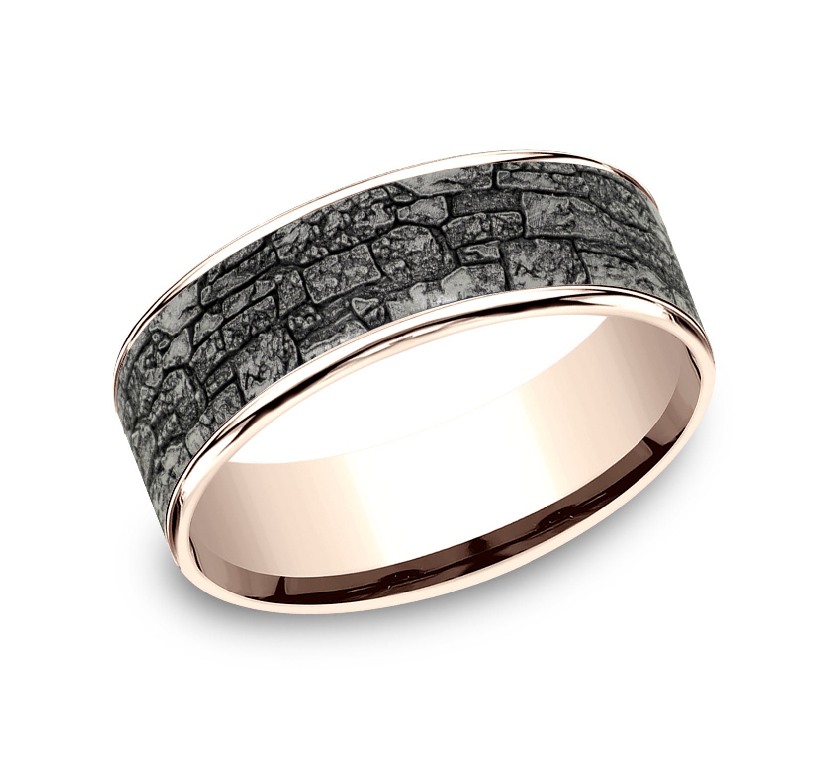7.5mm, Comfort fit 14K Rose Gold and Grey Tantalum Stone wall pattern, thin edges