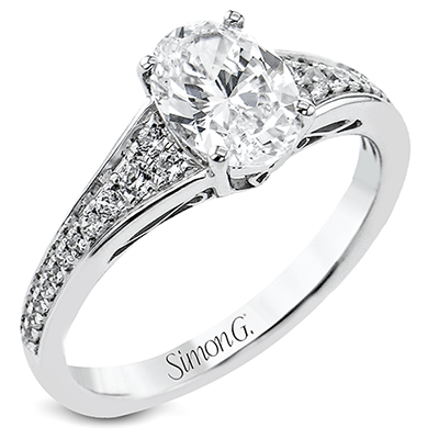 This white gold engagement ring takes an oval center stone and has a tapered shank, with diamonds .22 ctw graduating in size down the sides. On the profile there is hand carved filligree design. Center stone not included. Our rings can be designed to fit any center stone.