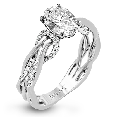 This impressive contemporary white engagement ring features a unique twisting design on the shank, which is complemented by .17 ctw of round cut white diamonds. Center stone not included. Our rings can be designed to fit any center stone.