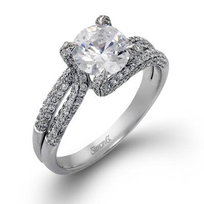 This lovely engagement ring showcases .59 ctw of white diamonds in a unique design. Center stone not included. Our rings can be designed to fit any center stone.