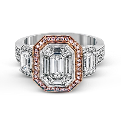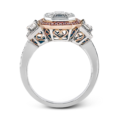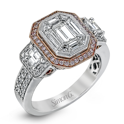 Featuring an eye-catching design, this stunning white and rose gold ring is highlighted by a 1.01 ctw center mosaic of white diamonds, accented by .28 ctw round white diamonds, .49 ctw emerald cut white diamonds, and .11 ctw round pink diamonds. Center stone not included. Our rings can be designed to fit any center stone.