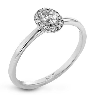 This exquisite, minimalist white gold ring features a halo containing .05 ctw of round white diamonds encircling a .17 ctw oval shaped white diamond Center stone not included. Our rings can be designed to fit any center stone.