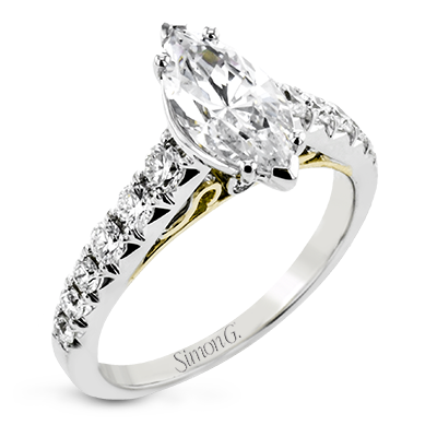 A touch of 18k yellow gold filigree on the interior of this ring adds a special touch to this 18k white gold engagement ring made for a marquise shape center stone. Center stone not included. Our rings can be designed to fit any center stone.