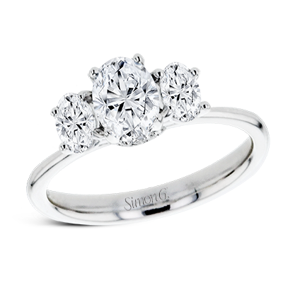 This 18k white gold engagement ring is a updated take on a classic three stone design, this time rendered with three sparkling oval shaped diamonds. Center stone not included. Our rings can be designed to fit any center stone.