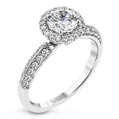 This delicate, vintage-inspired engagement ring sparkles with .42 ctw of round white diamonds in its halo and side details, all set in beautiful white gold. Center stone not included. Our rings can be designed to fit any center stone.
