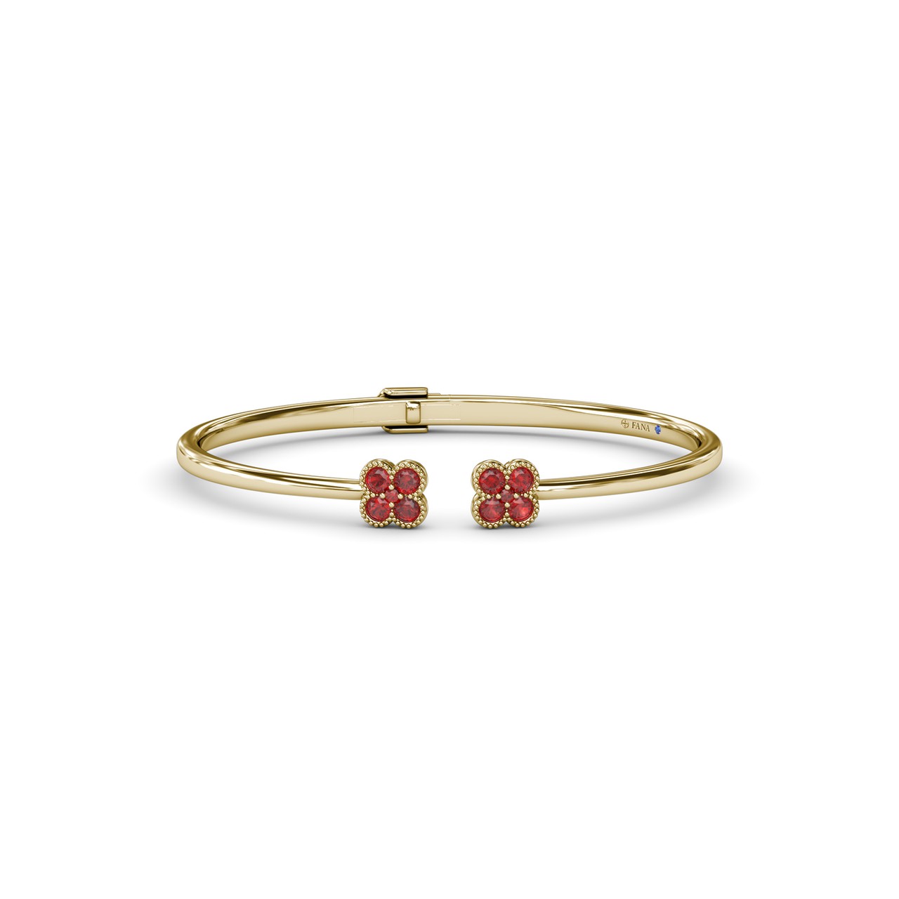 This magnolia bangle showcases round rubies arranged in a delicate double floral design. This bangle comes in a variety of material types like 14K & 18K white gold, yellow gold, rose gold and can be customized.