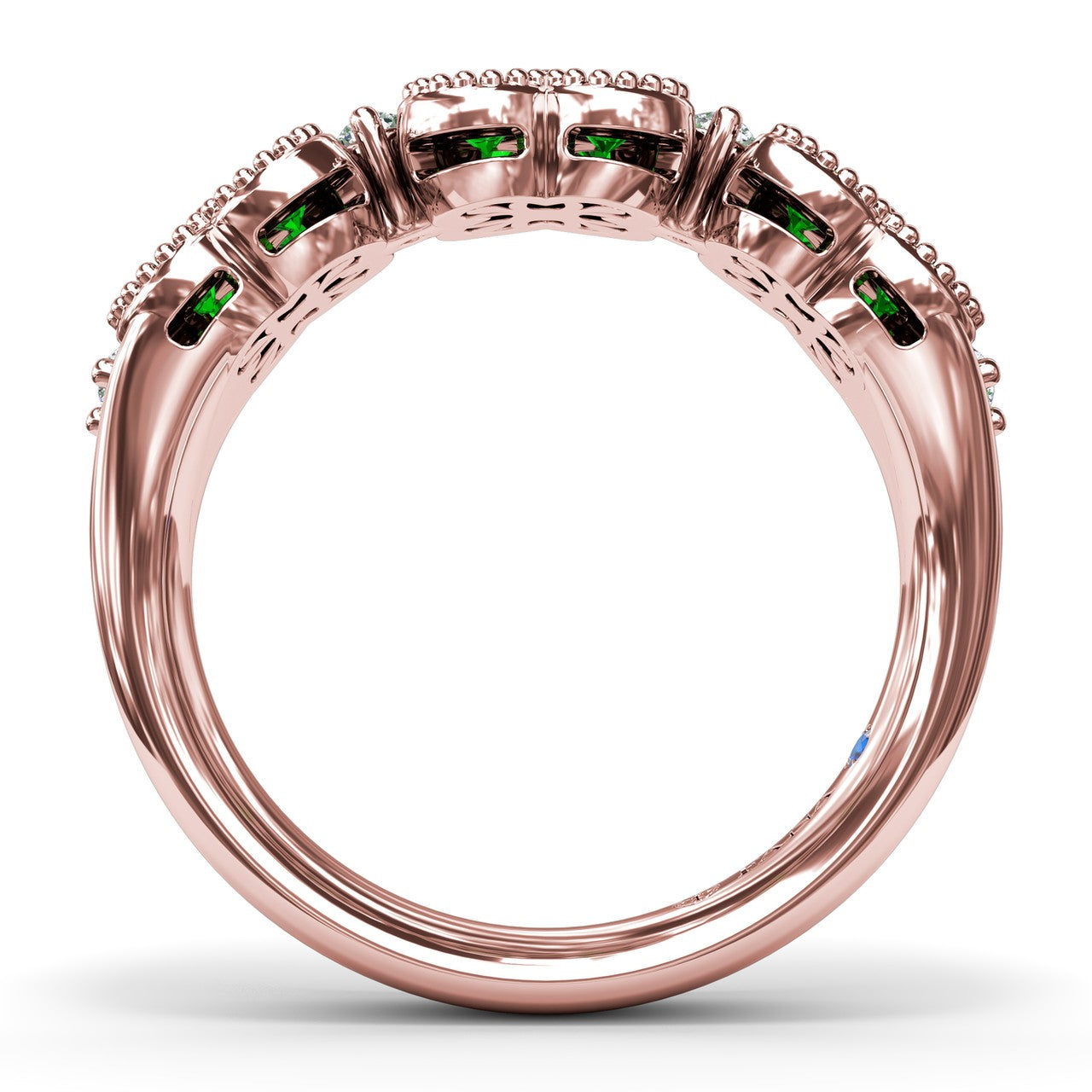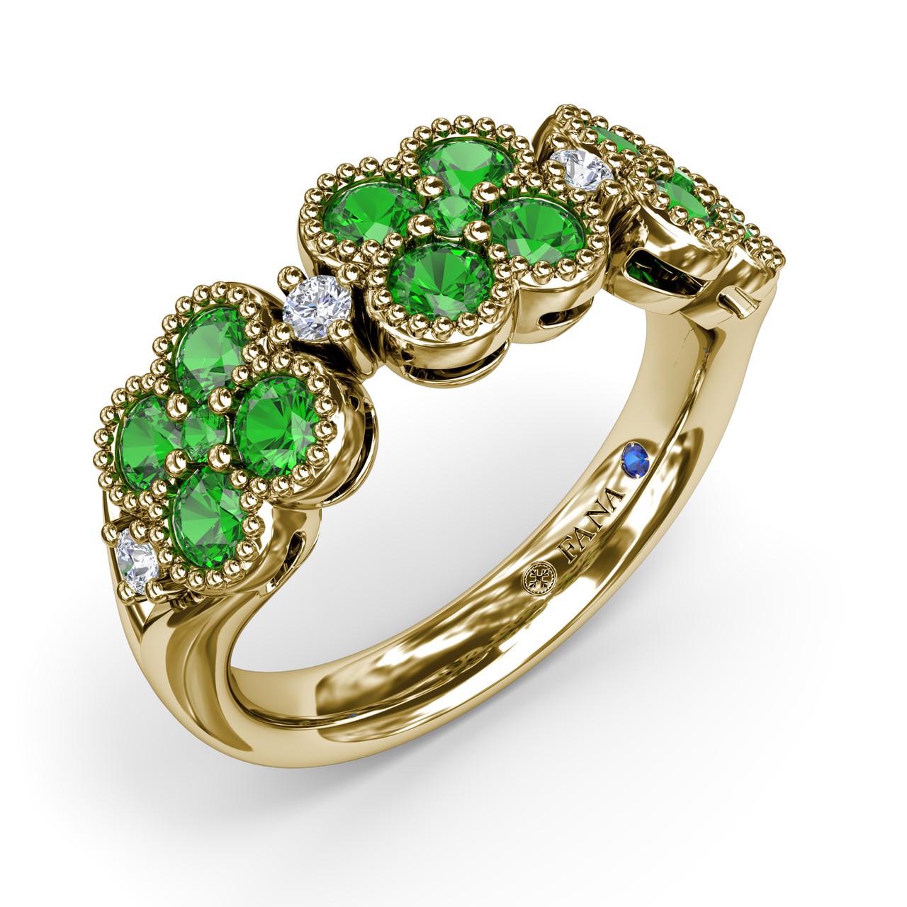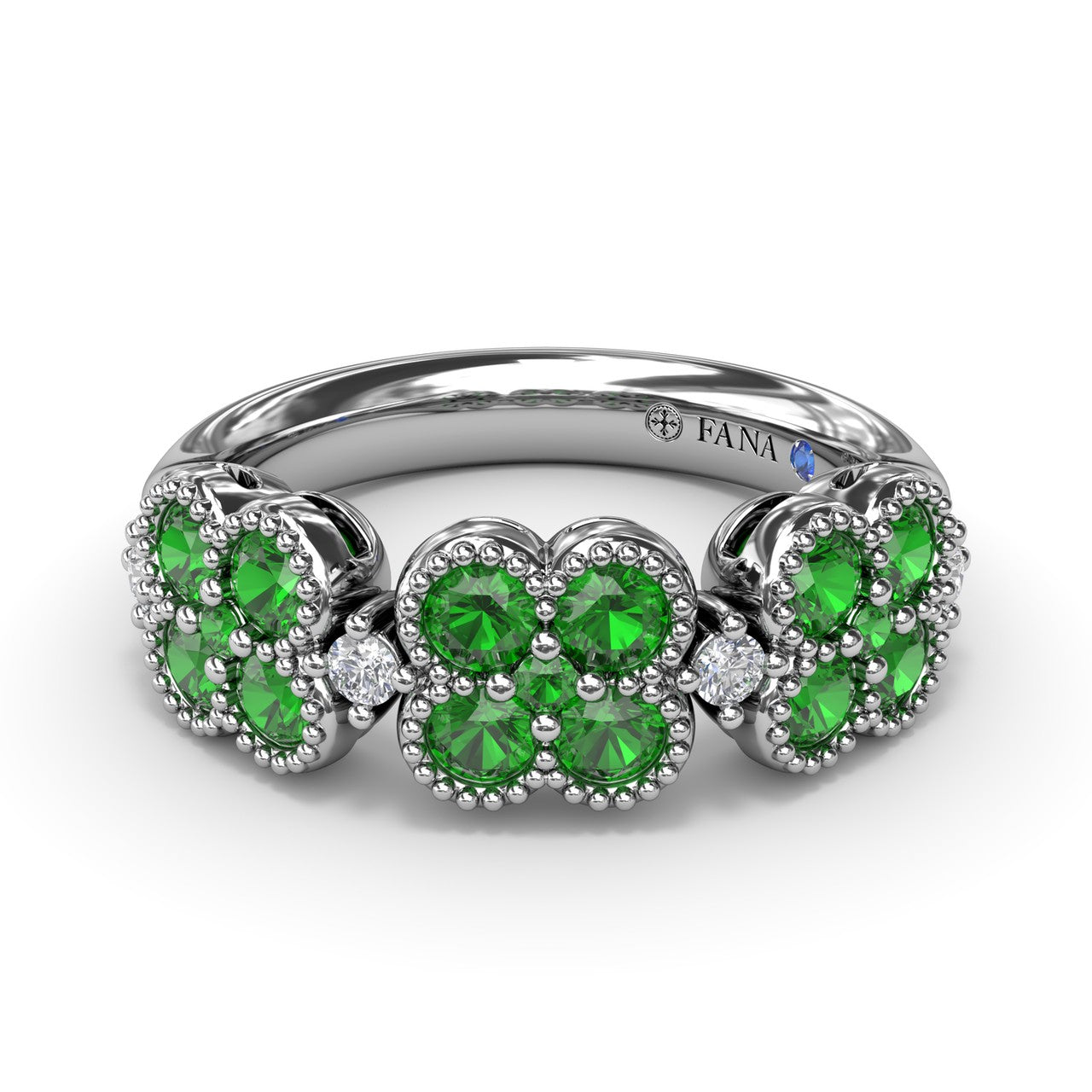This Magnolia ring features three captivating floral clusters, each formed by round emeralds. Nestled between each floral grouping is a sparkling diamond, adding a touch of brilliance to the design. This ring comes in a variety of material types like 14K & 18K white gold, yellow gold, rose gold and can be customized.