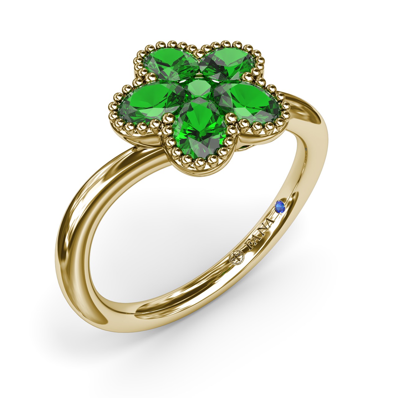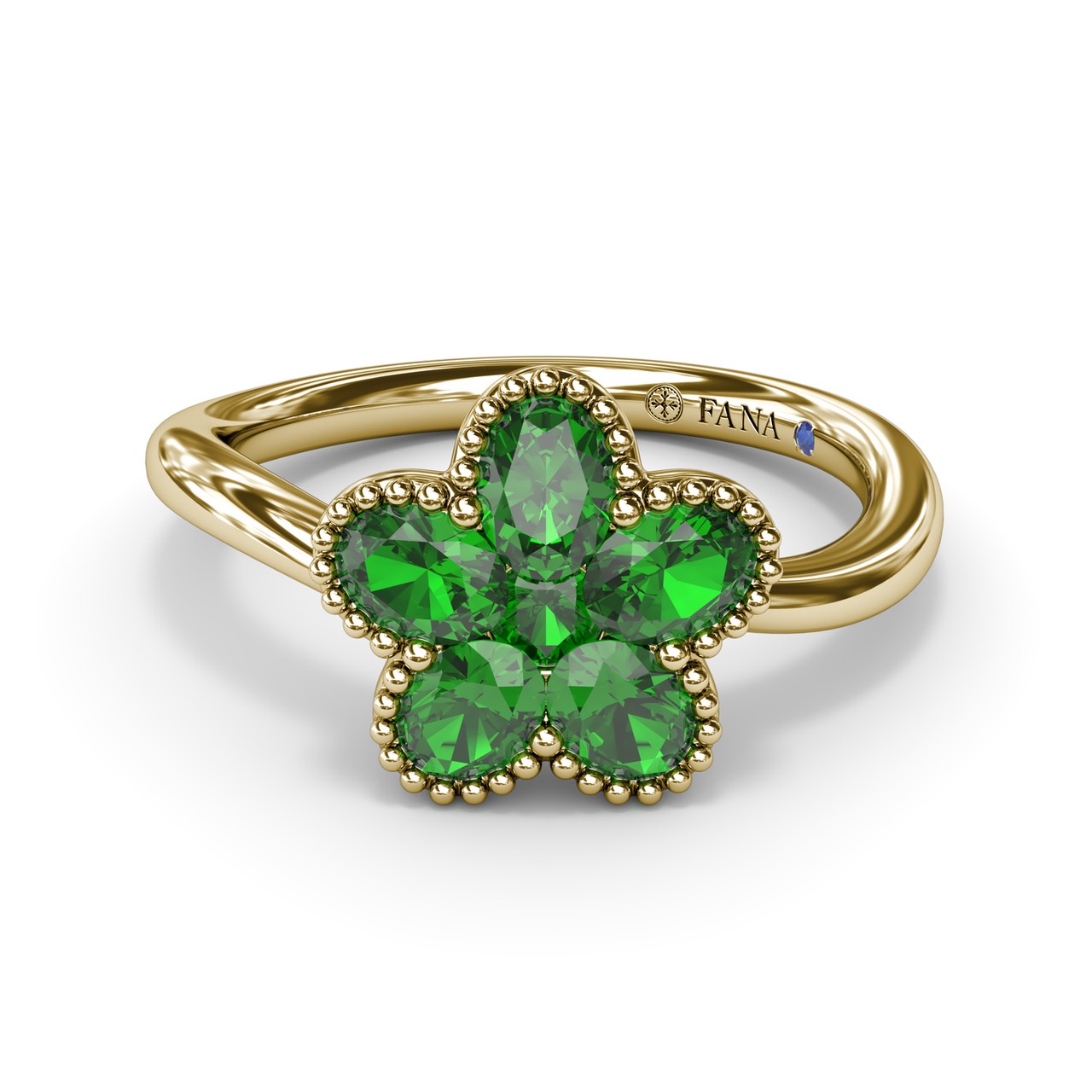This Magnolia wave ring features oval emeralds meticulously set to form a graceful floral design, accentuated by a delicate milgrain border. This ring comes in a variety of material types like 14K & 18K white gold, yellow gold, rose gold and can be customized.