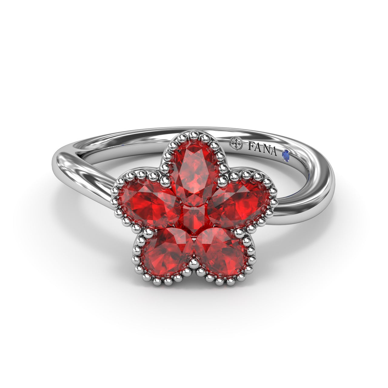 This Magnolia wave ring features oval rubies meticulously set to form a graceful floral design, accentuated by a delicate milgrain border. This ring comes in a variety of material types like 14K & 18K white gold, yellow gold, rose gold and can be customized.
