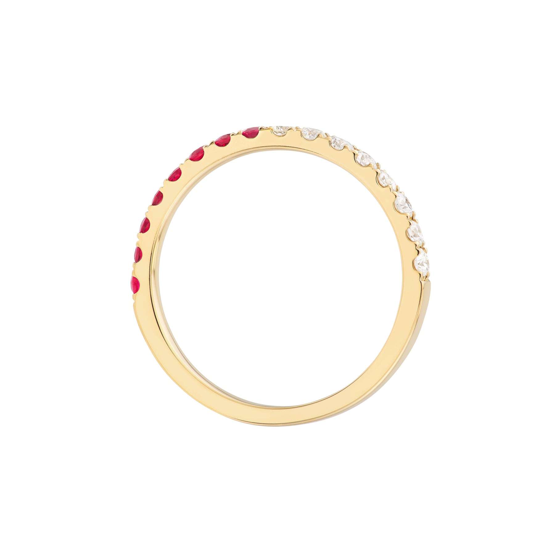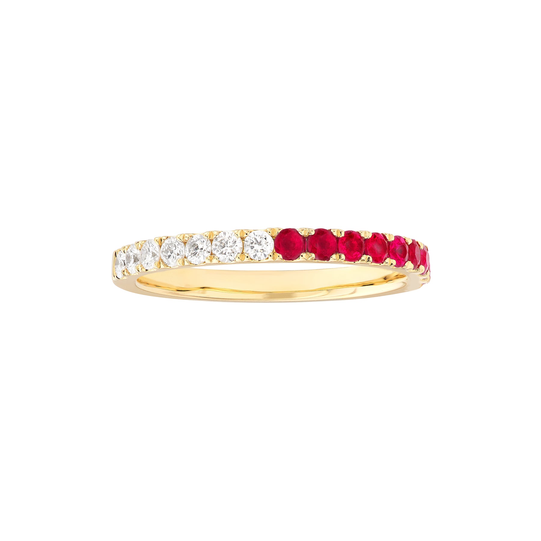 Celebrate a milestone with this alternating colored ring set halfway among a timeless 14K gold band. This band features 2mm diamonds & rubies.