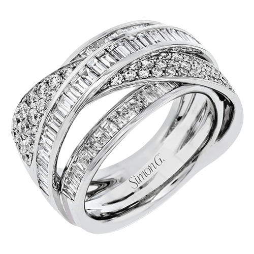 Bold and modern, this 18k white gold ring contains 1.11 ctw of baguette diamonds and .48 ctw of round diamonds set into a dynamic, overlapping design.