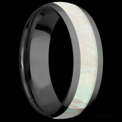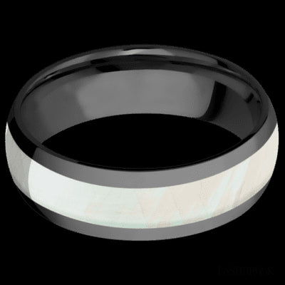 7 mm wide/Domed/Zirconium band with one 4 mm Centered inlay of Freshwater Mother of Pearl.