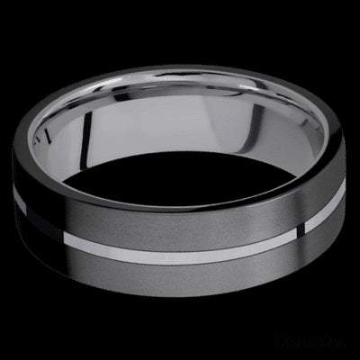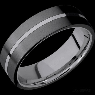 7 mm wide/Flat/Tantalum band with two 3 mm Double Off Center Edge inlays of Zirconium.