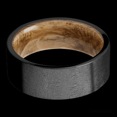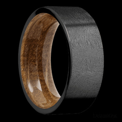 8 mm wide Flat Zirconium band featuring a Whiskey Barrel sleeve.