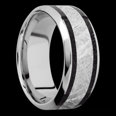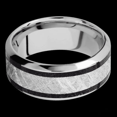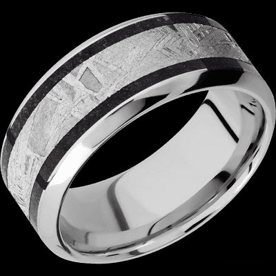 9 mm wide/High Bevel/Cobalt Chrome band featuring inlays of Dinosaur Bone Black and Meteorite.