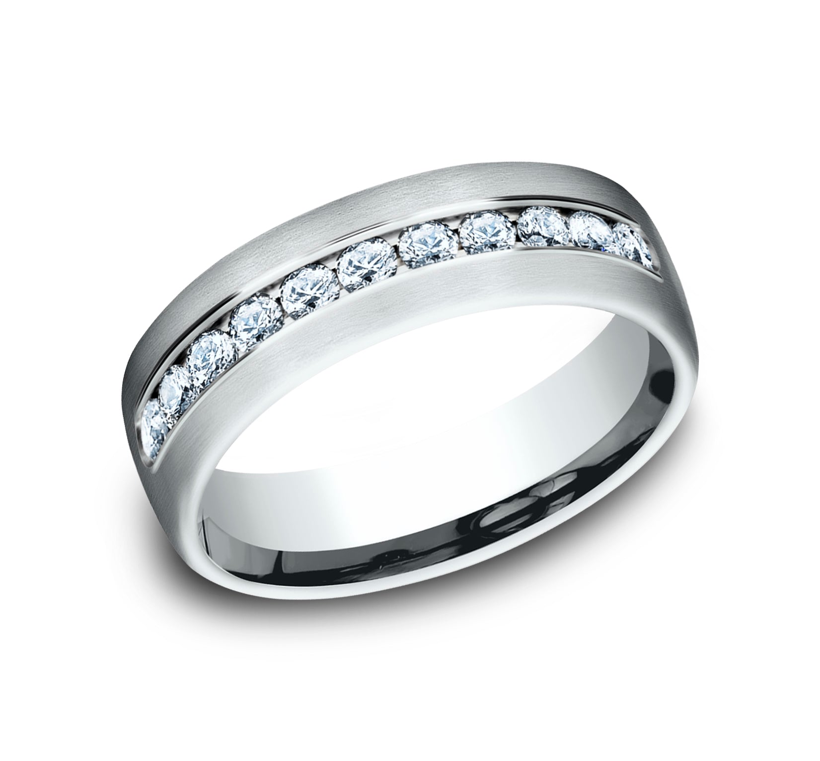 7.5mm, Comfort fit 14K White Gold Satin finish 11 channel set diamonds Carat weight is .66ct Clarity SI1-2, Color GH