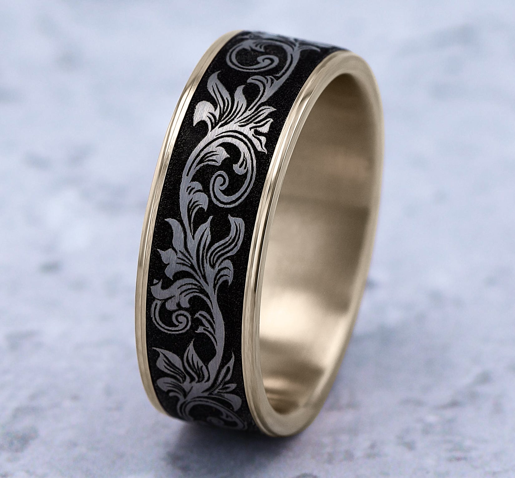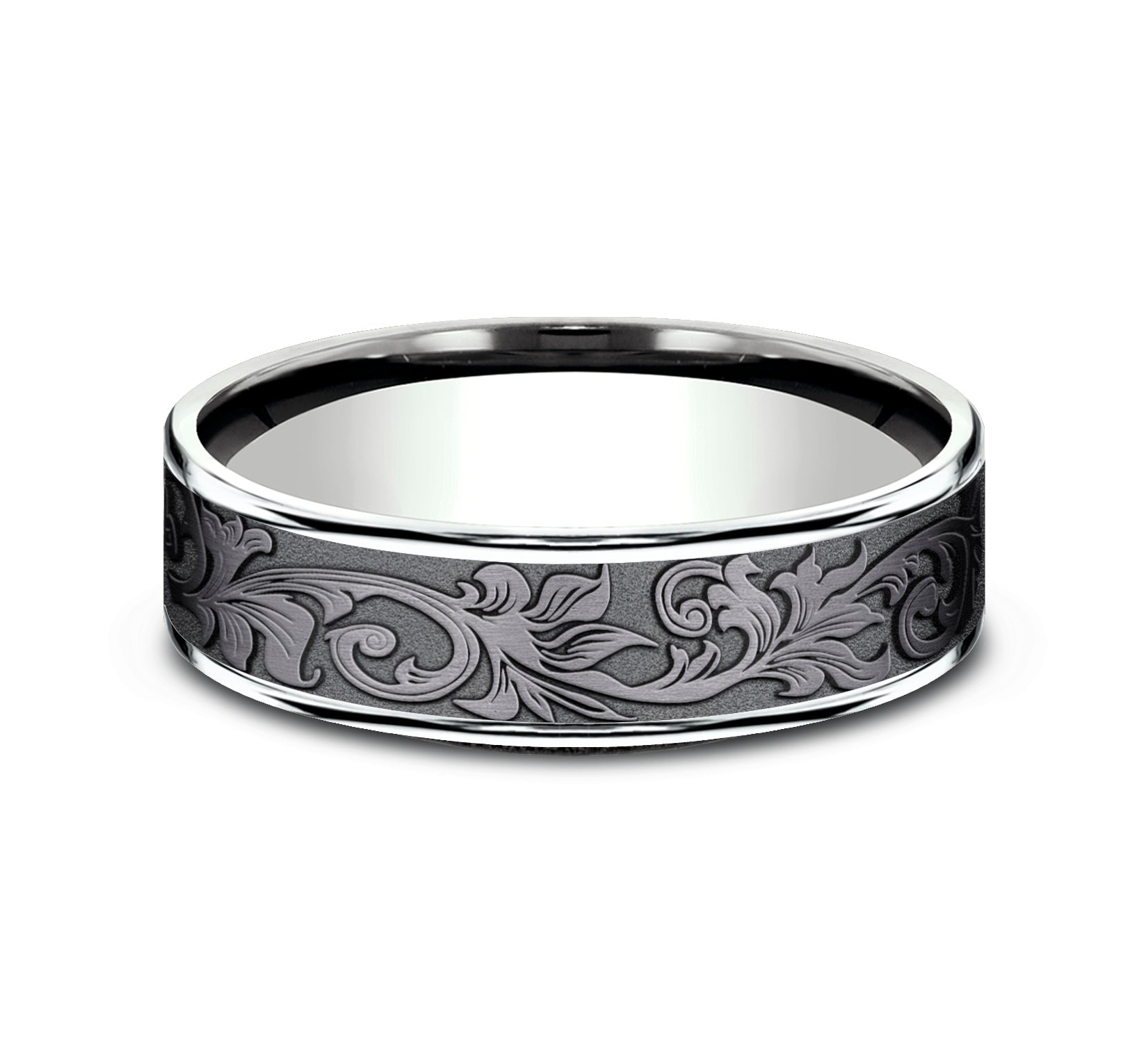6.5mm, Comfort fit 14K White Gold and Darkened Tantalum Vintage script pattern, polished thin edges