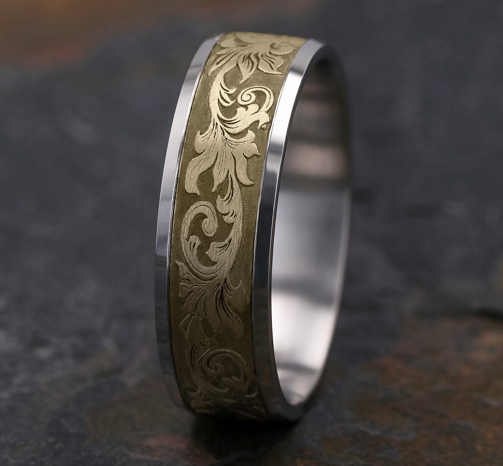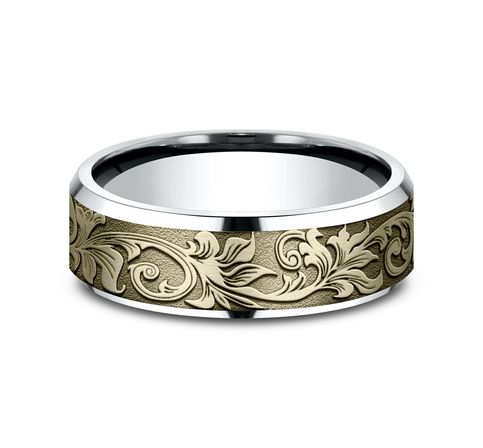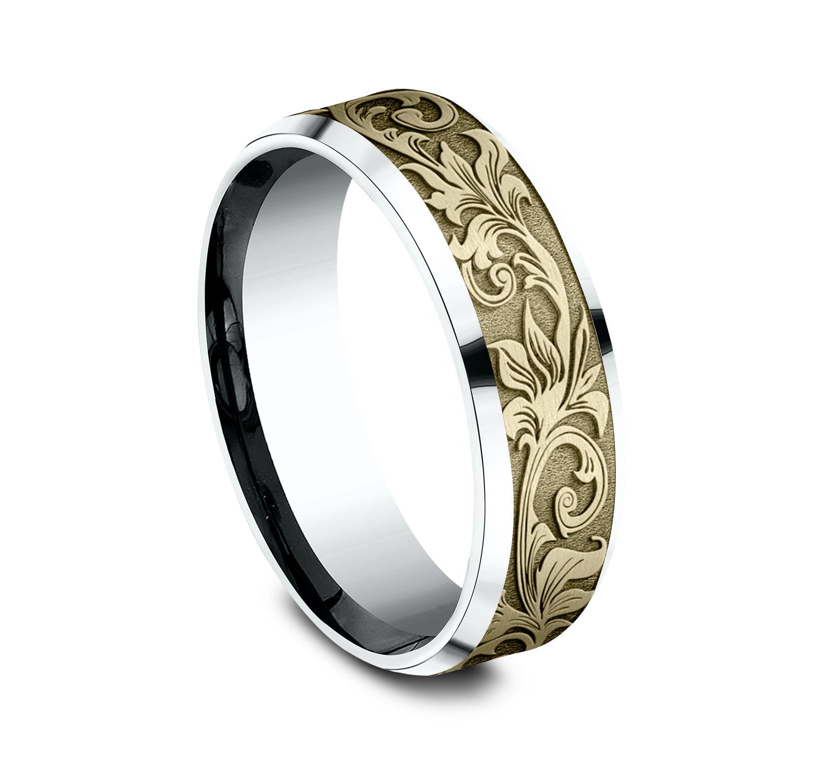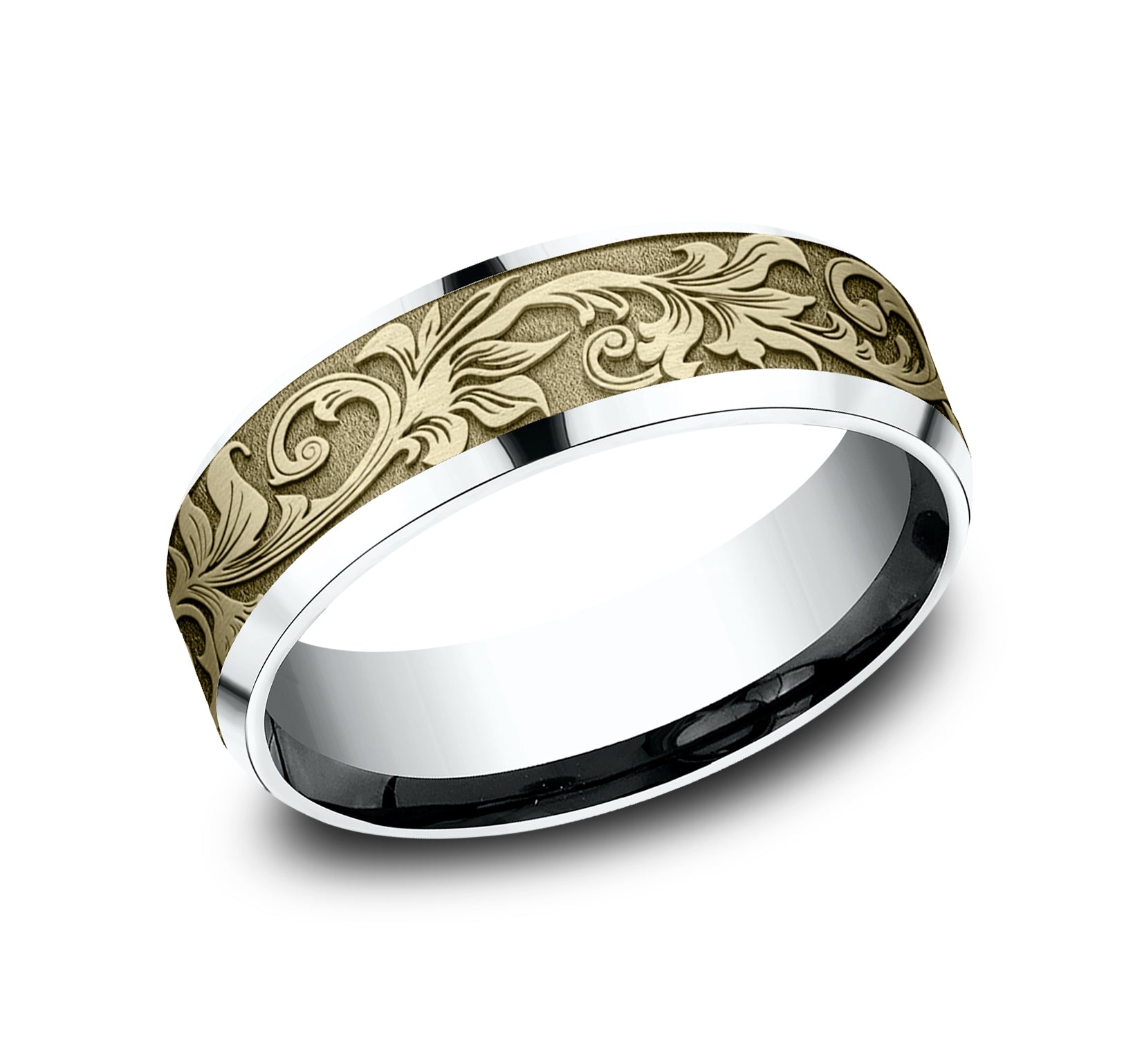 7mm, Lightweight comfort fit 14K White and Yellow Gold Vintage script pattern, polished bevel edges