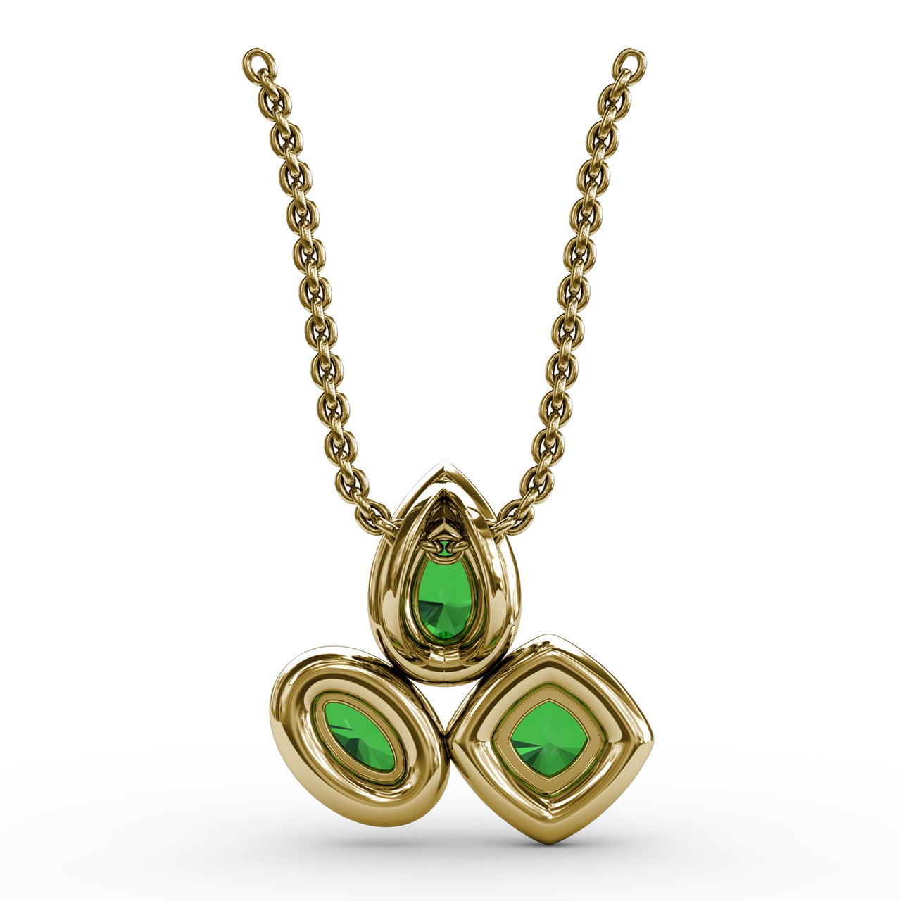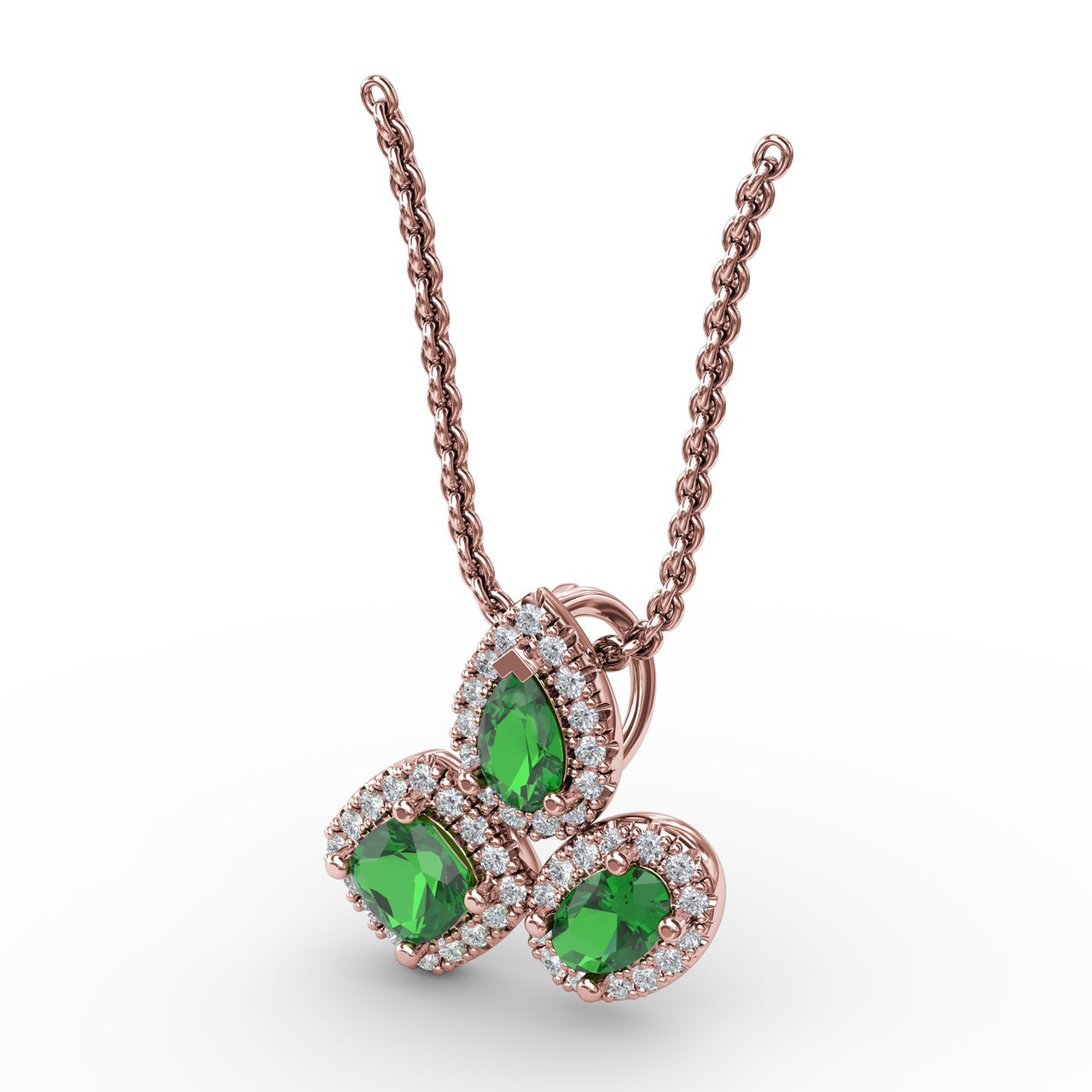 An abstract collection of three precious emeralds surrounded by pav� diamonds for the most perfect mix of luxury and elegance. This pendant comes in a variety of material types like 14k white gold, yellow gold, rose gold and can be customized. Fana gemstone pendants are perfect for that special woman in your life.