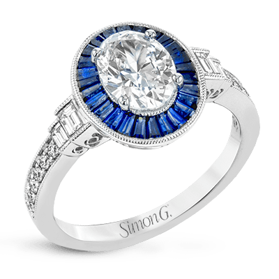 This remarkable ring features milgrain edging and .75 ctw of baguette shaped sapphires in its halo, flanked by .11 ctw of round white diamonds and .16 ctw of baguette shaped white diamonds. Center stone not included. Our rings can be designed to fit any center stone.