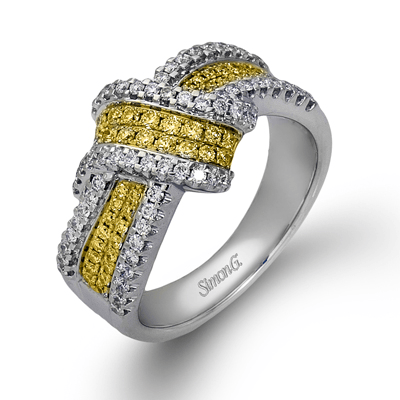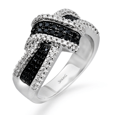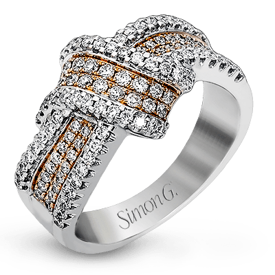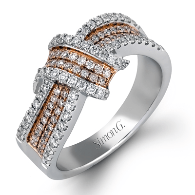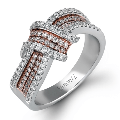 Featuring a completely modern twist design, this dramatic white and rose ring is highlighted by .72 ctw round cut white diamonds.
